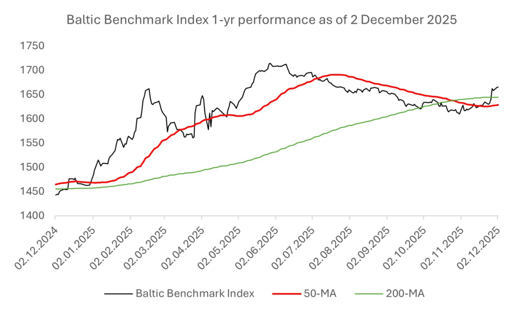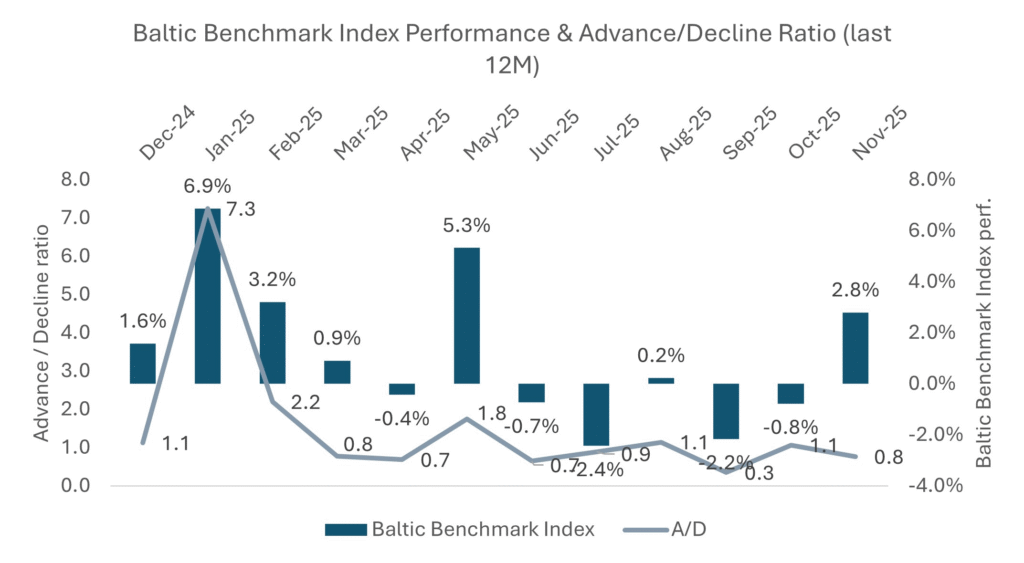Following the 2.9% Baltic Benchmark decline in Sep-Oct, Nov. was strong with a gain of 2.8% as Artea Bank, Infortar, and KN Energies posted double-digit gains. However, the Nov. Advance/Decline ratio (rising/falling stocks) of 0.8 shows the market’s gain was not broad-based. Overall, 2025 appears to be a constructive year with the Baltic Benchmark +14% year-to-date (as of 2 Dec.). This year’s winners among tradable stocks are Akola Group (+54%), KN Energies (+48%), and Merko Ehitus (+35%). With the Baltic Benchmark Index 50-day MAV just 1% below the 200-day MAV, we reiterate our “Positive” Baltic market outlook, mainly based on valuation. Our Overall Top pick list (3 stocks) is up 32% while our “Stable dividends” Top picks list (3 stocks) is up 45%. With this said, we switch 2 out of 3 names in both lists as we think some stocks need to consolidate after stellar gains and we see compelling new overlooked cases for 2026 (since 2023, we have only made two changes to our top pick lists). From a sector perspective, we like banks as interest rates seem to stabilize at current levels and retail bond investors are happy to take over non-performing loans i.e., the bank’s loan impairments might not be as bad as we feared (might even see reversals). From a country-perspective, we favor Lithuania who seem to do everything right, while Estonia is doing the opposite. Furthermore, the Lithuanian pension reform might trigger a rally in Lithuanian stocks (likely 30-50% of the pension savers will take their money out either to invest themselves or to spend it). See this Premium article for our 2026 Top picks.