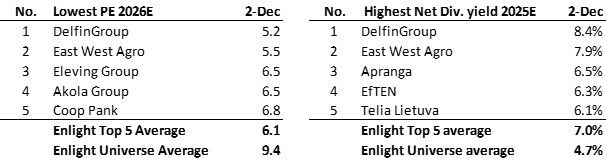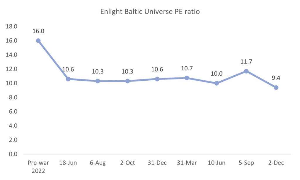 As we are nearing 2026, we shift our PE focus to 2026E from 2025E. For dividend yield, we still focus on 2025E as dividends have yet to be announced and will be paid in 2026. The five companies in our universe (21 companies) with the lowest PE 2026E trade at an average multiple of 6.1x, which is lower than the 7.2x multiple in our last quarterly update (post Q2/25 reports). Part of the multiple contraction is due to the switch from 2025E to 2026E. The 2025E PE average for the top five companies is 6.3x i.e., still lower than in our last quarterly update and not far from 2026E multiple. The PE multiple has also contracted for our whole universe from 11.7x to 9.4x. The universe PE of 9.4x is 41% lower vs. the 2022 pre-war 16.0x multiple i.e., there is a 41% war discount on Baltic equities. The five stocks in our universe with the highest dividend yield have an average 2025E yield of 7.0% (up from 6.4% in our last quarterly update), compared to the whole universe yield of 4.7%. The 7.0% average yield for the Top five companies is on par with the Baltic corporate bond yield. Given the low equity valuation, we regard the equity yield as more attractive than the bond yield as there is also upside potential from share price appreciation.
