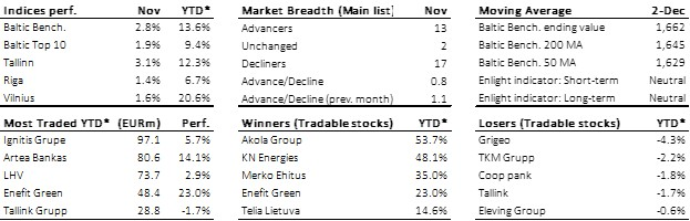 Despite the “weakish” Autumn (Baltic Benchmark lost 2.9% in Sep-Oct), the Baltic technical picture has not broken down (much due to strong Nov +2.8%) with the 50-day moving average just 1% below the 200-day moving average (1,629 vs. 1,645) as seen in below chart. Furthermore, among the Baltic tradable stocks, there are only five stocks in the minus year-to-date and they are only down 1-5% (adjusted for dividends, they are up). Meanwhile, the five year-to-date winners are plus 15-54%. Consequently, we keep our “Positive” outlook on the Baltic equity market even though we had a challenging Autumn.